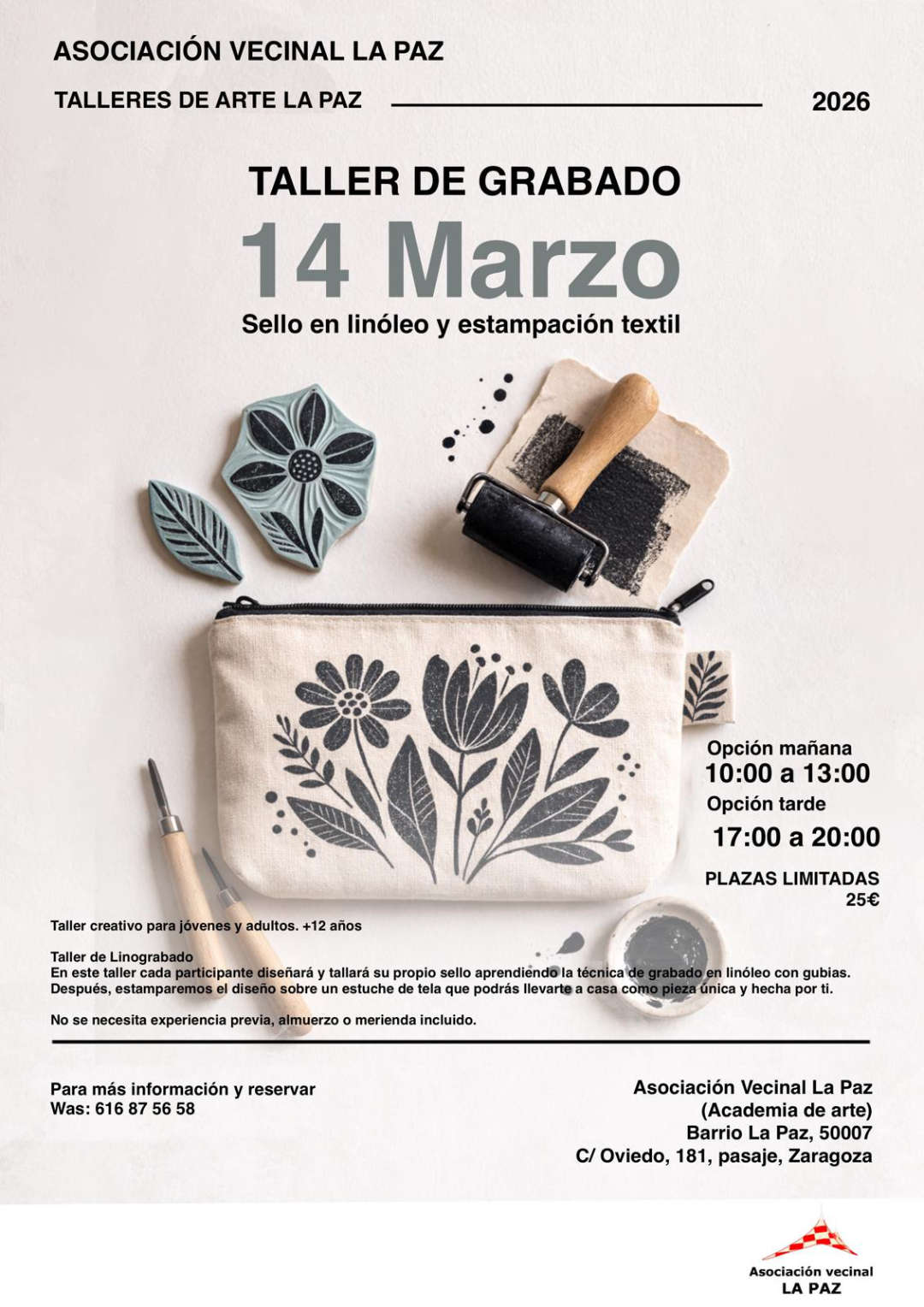 El sábado 14 de marzo la Asociación Vecinal La Paz y los Talleres de Arte la Paz os traen un Taller de Linograbado. En la Asociación Vecinal La Paz (Academia de arte) C/ Oviedo, 181, pasaje. Se trata de un taller creativo para jóvenes y adultos. +12 años En este taller cada participante diseñará y tallará su propio sello aprendiendo la técnica de grabado en linóleo con gubias. Después, estamparemos el diseño sobre un estuche de tela que podrás llevarte a casa como pieza única y hecha por ti. No se necesita experiencia previa, almuerzo o merienda incluido.
